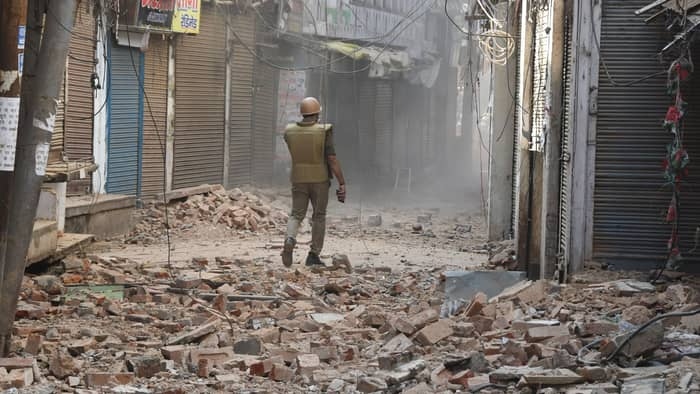 वाराणसी|दालमंडी की सड़क चौड़ीकरण के लिए ध्वस्तीकरण का अभियान जारी है। मंगलवार को बुलडोजर की मदद से 14 नए भवन ध्वस्त किए गए। कड़ी सुरक्षा के बीच दालमंडी में ध्वस्तीकरण की कार्रवाई की जा रही है। सोमवार को जो 21 भवन ध्वस्त किए गए थे, उनका मलबा हटाने का काम भी जारी रहा। साथ ही नए भवन ध्वस्त किए गए तो इसका विरोध हुआ। महिलाओं ने हंगामा किया। किसी ने दो महिलाओं का वीडियो सोशल मीडिया पर साझा किया जो पुलिस कर्मियों को खरी-खोटी सुना रही हैं। तस्वीरों में देखें- ध्वस्तीकरण की कार्रवाई...